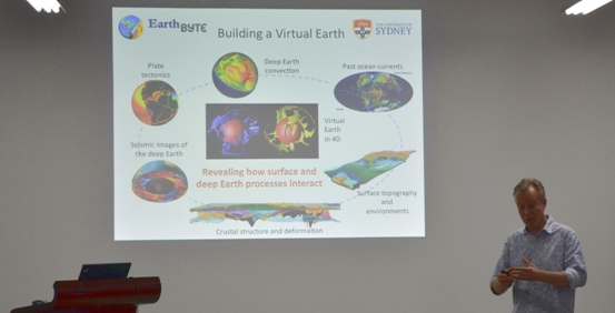 Müller教授首先簡要介紹了悉尼大學EarthByte課題組基本情況,以及利用EarthByte課題組開發的GPlates軟件構建虛擬地球的方法,展示了其相關的研究成果。隨后,他詳細講解了威爾遜旋回中的洋中脊長度、海底擴張速度、俯沖洋殼年齡等參數,影響海水中鈣與鎂的比重、洋底熱流分布的機制。