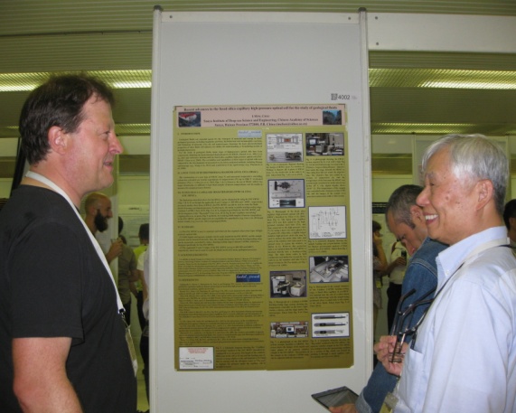 8月15日至21日,中科院三亞深??茖W與工程研究所(籌)深海極端環境模擬研究實驗室主任周義明研究員應邀參加在捷克共和國布拉格舉辦的Goldschmidt國際會議。會議期間,周義明研究員做了題為“Recent Advances in the Fused Silica Capillary High-Pressure Optical Cell for the Study of Geological Fluids”的墻報展示,與來自各國的地質學家和參展者交流,并與多年前指導過的學生Anat Shahar(今年Clarke Medal獲獎者)合影留戀。