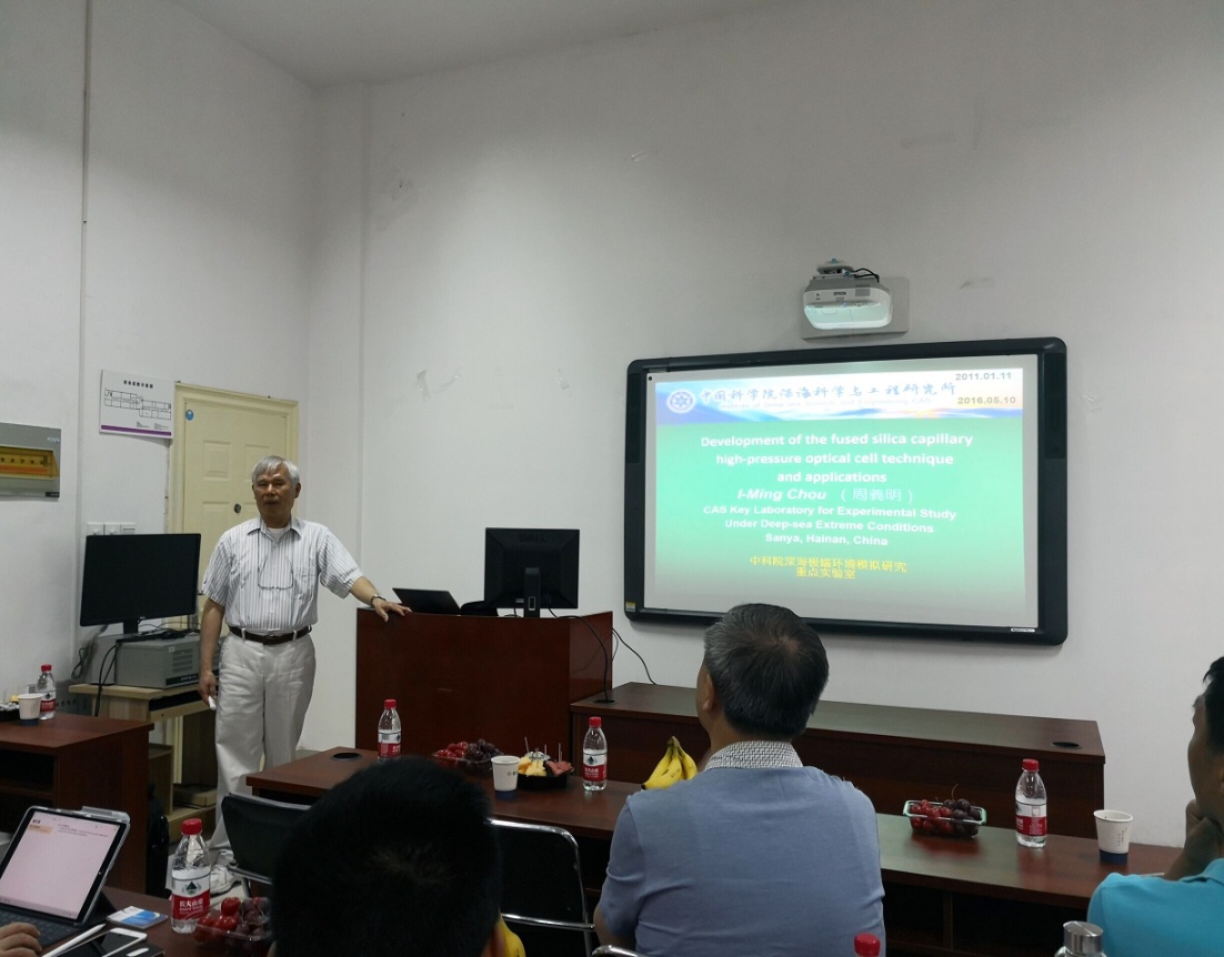 報告中,周義明研究員介紹了高壓微型可視毛細硅管與拉曼光譜聯(lián)用技術(shù)的研發(fā)歷史背景及多位從中國到美國地質(zhì)調(diào)查局其實驗室參與初期研發(fā)工作的訪問學(xué)者的貢獻,同時也介紹了目前在深海極端環(huán)境模擬研究實驗室的主要工作內(nèi)容及面對的挑戰(zhàn)和前景。目前,此高壓微型可視毛細硅管與拉曼光譜聯(lián)用技術(shù)已被廣泛的應(yīng)用到與地質(zhì)及環(huán)保相關(guān)的流體研究,主要包括在中國、美國、加拿大、法國、及澳大利亞的科研機構(gòu)。其他多位與會者及前訪問學(xué)者也介紹了他們在這方面的科研進展并熱烈地參與交流討論。