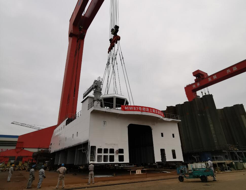 10月10日上午,福建馬尾船廠,萬米載人潛水器支持保障母船MW87號(hào)(暫定名)順利完成上建總段吊裝,這標(biāo)志著該船主體結(jié)構(gòu)建造完成、科考設(shè)備及其科學(xué)與工程實(shí)驗(yàn)室等改造布局已確定,是船舶建造改造的關(guān)鍵節(jié)點(diǎn)之一。