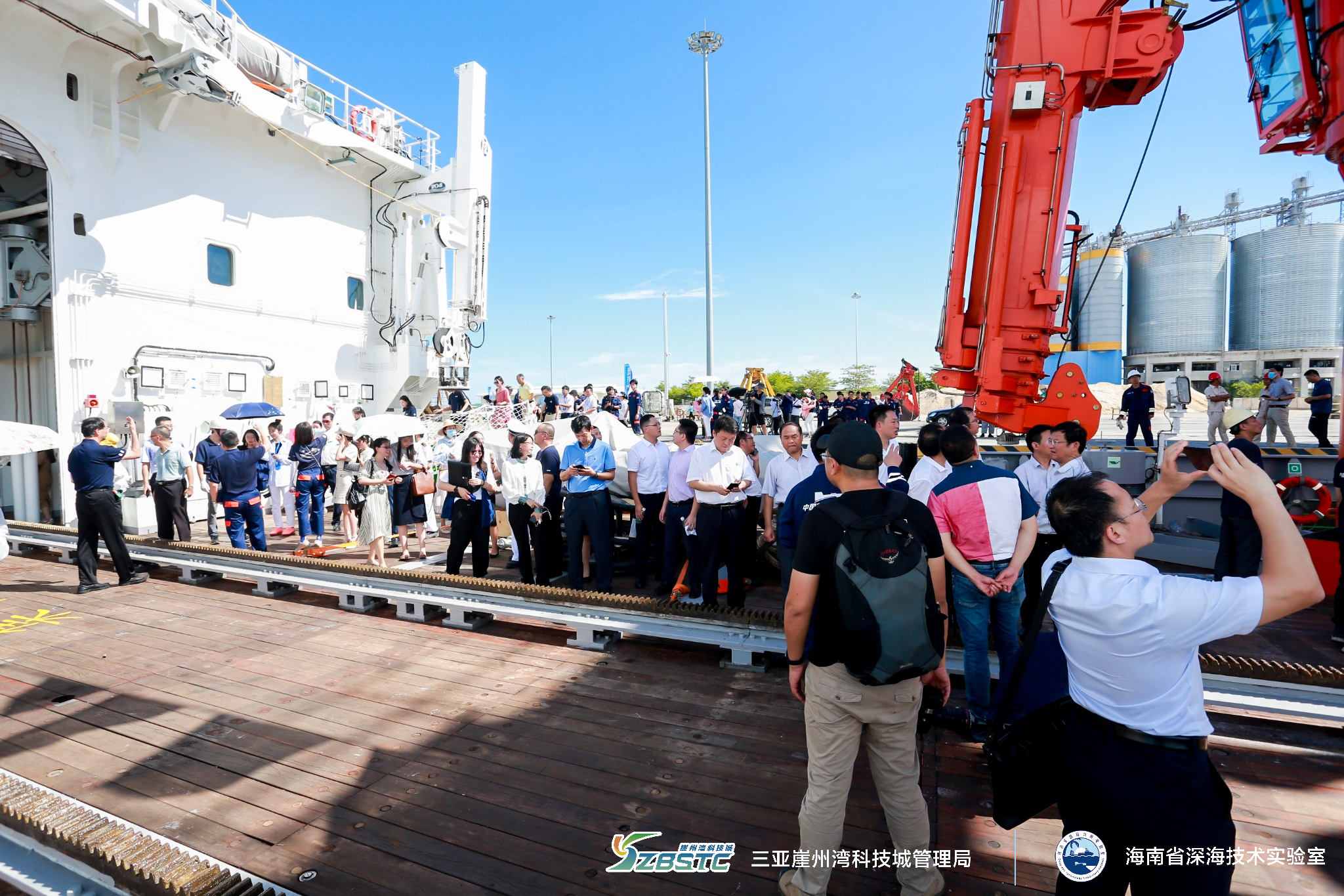 6月25日, “探索二號”船從福建馬尾造船廠碼頭啟航,經(jīng)過830海里的航程, 28日下午,順利抵達三亞崖州灣科技城南山港碼頭。來自海南省人民政府、海南省科學技術(shù)廳、深圳市規(guī)劃和自然資源局、中國船舶集團702研究所、704研究所、武漢理工大學、中科院沈陽自動化所、中科院聲學研究所、三亞崖州灣科技城管理局等相關(guān)單位代表共200余人參加接船儀式。