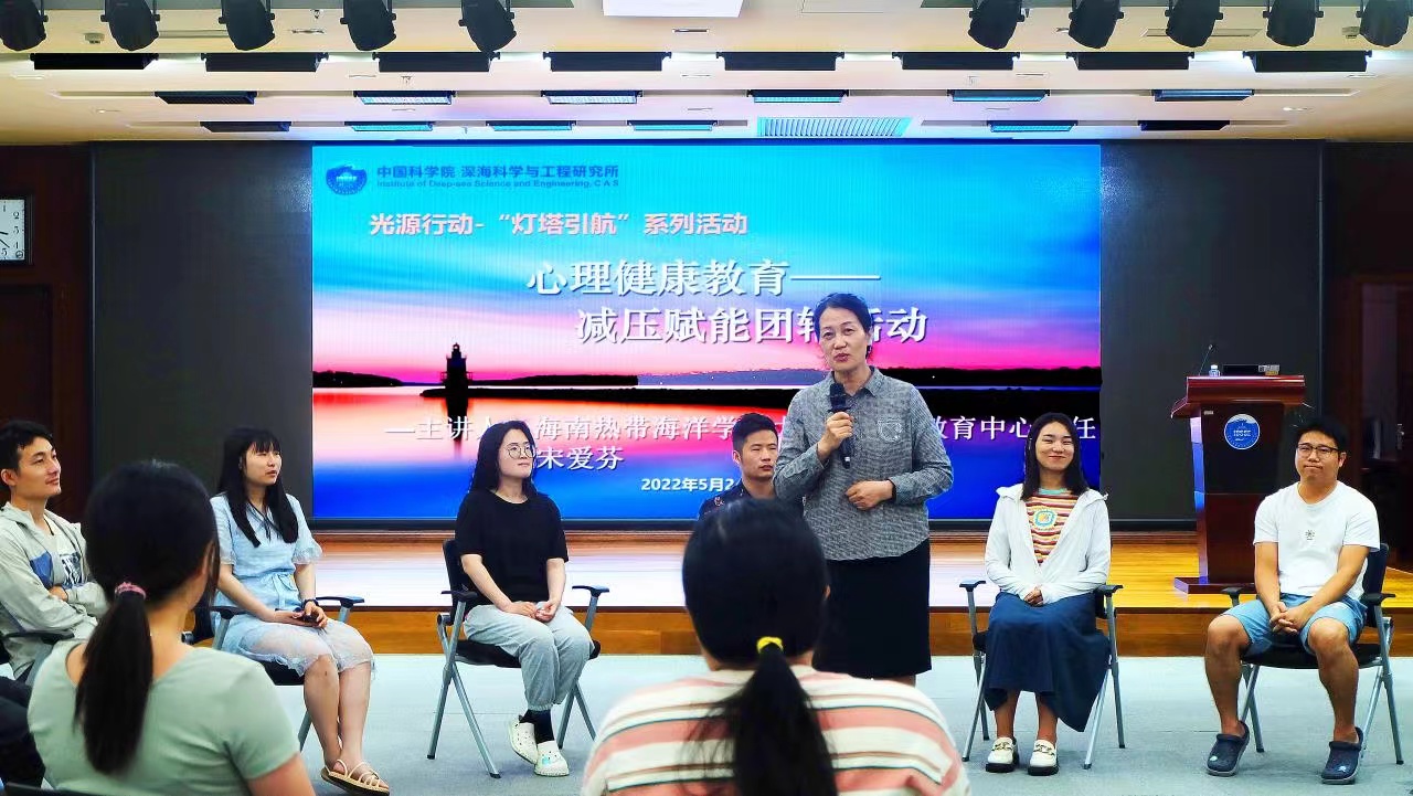 5月24日下午 ,光源行動——“燈塔引航”系列沙龍活動第九講在深海所綜合樓1003會議室舉辦。此次活動的主題是:研究生心理關愛活動--減壓賦能團輔活動,由海南省拔尖人才、海南熱帶海洋學院大學生心理教育中心主任、海南省心理咨詢行業協會副會長宋愛芬教授主講。此次活動以游戲集體活動的形式開展。