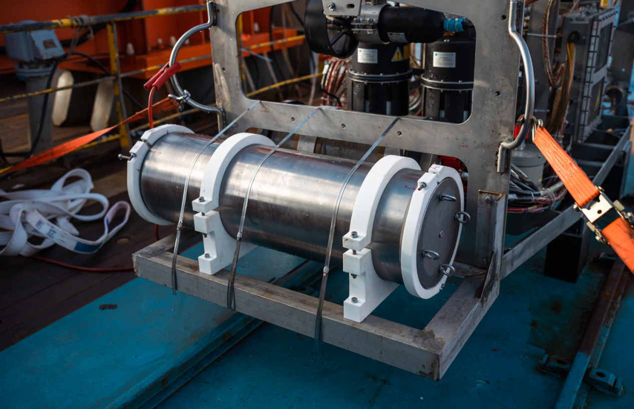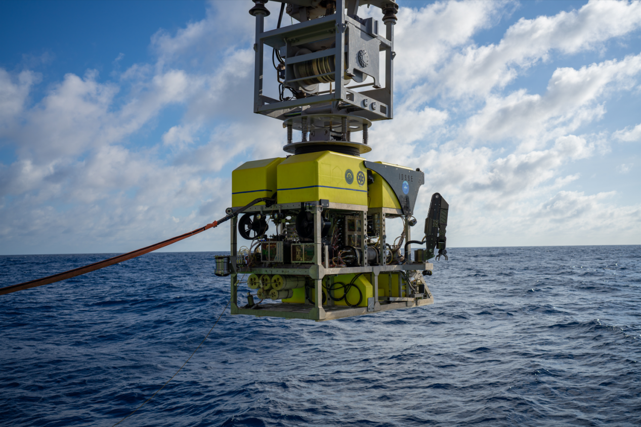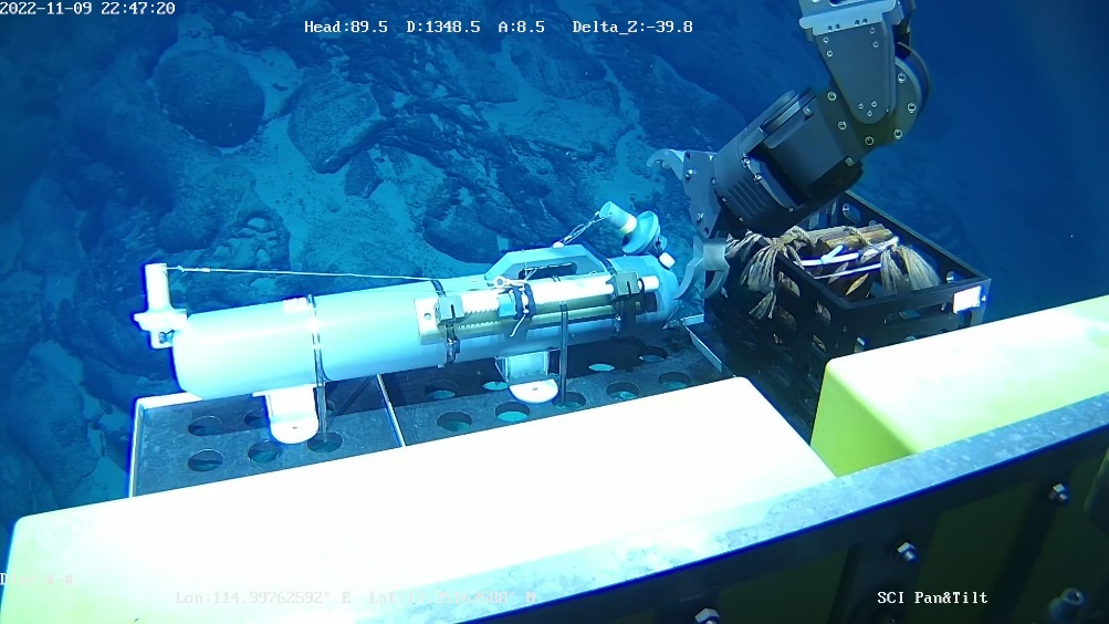 在本航次中,“探索二號”船通過光電復合鎧裝纜連接至中繼器,再通過非金屬輕質光電復合臍帶纜連接至ROV。中繼器與ROV組成柔性連接的分體式系統,該系統進行了4500米級海上試驗應用,有效驗證了“中繼器-ROV”的分體式布放-回收方案及測試流程,以及ROV各分系統及模塊的設計性能指標,并充分測試了ROV在4500m級大工作深度下的綜合作業能力,如定高、定深、定向、定速、樣品抓取收集等