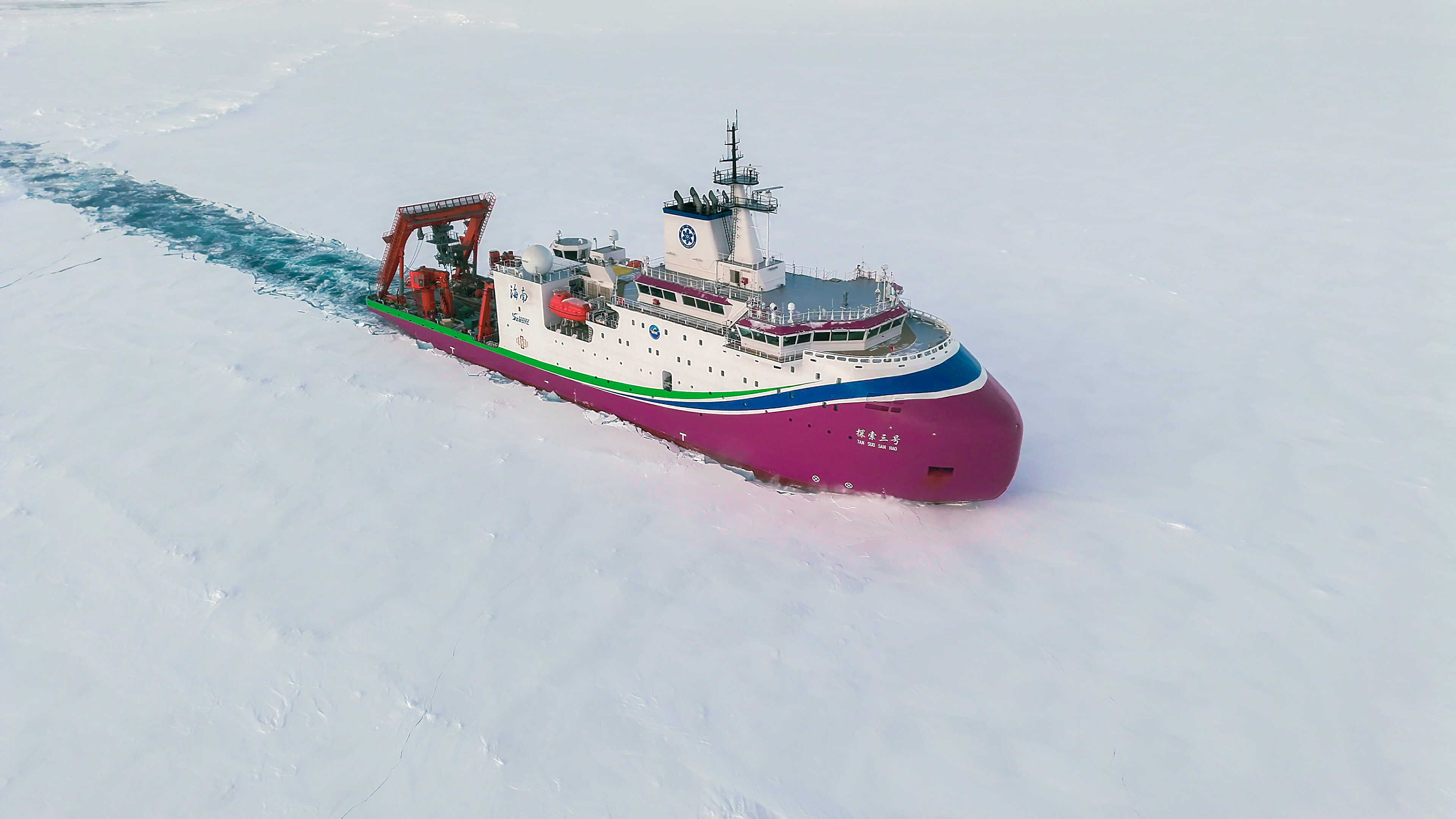 探索三號”在北極密集冰區破冰航行