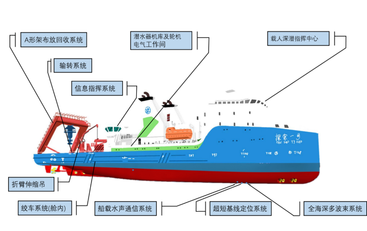 “探索一號”船,由科技部和中國科學院支持購置和改建,分別于2016年5月、2017年8月和2019年6月完成三期改建,主要任務是搭載奮斗者號載人潛水器在全球深淵區開展6000米以深深潛作業和綜合調查任務。
