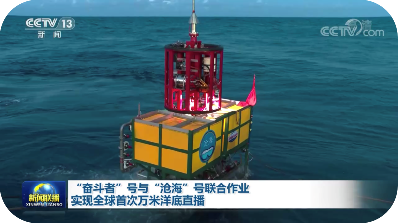 全海深視頻直播系統是在國家重點研發計劃“深海關鍵技術與裝備”重點專項“全海深視頻直播”項目支持下成功研制的。該系統由“滄海”號視頻直播著陸器、“凌云”號視頻直播著陸器、深海中繼器、水面控制系統和衛星直播系統五部分組成。其中,“滄海”號視頻著陸器搭載了項目組研制的全海深超高清3D相機、全海深超高清相機、全海深微光相機、全海深照明系統、全海深無線/有線光通信系統等載荷,具備全海深超高清視頻實時采集、傳輸、處理和直播功能。于2020年11月,與“奮斗者”號全海深載人潛水器在馬里亞納海溝開展聯合海試作業,將其在萬米海底進行科考作業的過程,向全國人民進行了世界上首次萬米海底的高清視頻實況直播和科普教育;在國際上首次實現萬米海底“奮斗者”號全海深載人潛水器艙內潛航員與中央廣播電視總臺新聞直播間的實時高清視頻對話。此次成功示范應用,不僅對我國全海深科考提供視頻技術與裝備支撐,同時對我國廣電領域在深海進行高質量的電視信號制作、傳輸提供一條新的途徑。該成果向建黨一百年周年獻上一份賀禮,彰顯我國綜合國力、深海技術與裝備實力,極大增強民族自豪感與自信心。